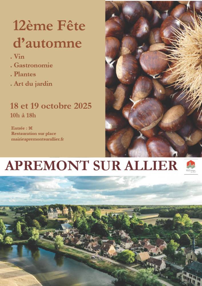 12ème fête d’automne d’Apremont dédiée aux plantes, à l’art du jardin et aux produits du terroir Entrée 1€ 70 exposants pour fêter l’automne exposeront leur belle production sur les pelouses des bords d’Allier d’un des « Plus Beaux Villages de France »! Un rendez-vous incontournable pour tous les amateurs de jardin qui désirent l’embellir à la saison idéale des plantations, mais aussi pour tous les amateurs de produits du terroir (vin et gastronomie). La buvette communale et son menu automnal sera ouverte pour vous restaurer.