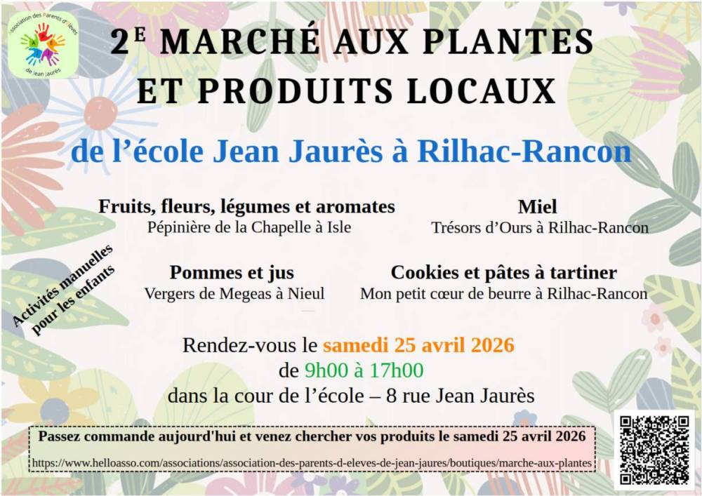 Retrouvez-nous le samedi 25 avril 2026 de 9h00 à 17h00 dans la cour de l'école. Vous trouverez cette année : - fruits, légumes, aromates et fleurs de la pépinière de la Chapelle à Isle, - pommes et jus des vergers de Megeas à Nieul, - miel de Trésors d'Ours à Rilhac-Rancon, - cookies maison de Mon petit cœur de beurre à Rilhac-Rancon. Les bénéfices de la vente contribueront à diminuer le coût du voyage de fin d'année au Puy du fou. Activités manuelles pour les enfants Entrée Gratuite On compte sur vous !