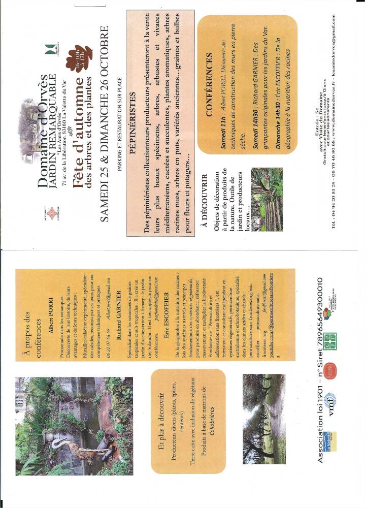 Pépiniéristes collectionneurs et producteurs présenteront à la vente leurs plus beaux spécimens, arbres arbustes, vivaces méditerranéens, cactées et succulentes... Objets de décoration à partir de produits de la nature. Conférences: Samedi 11h : Techniques de construction des murs en pierre sèche. Samedi 14h30 : Richard Garnier : Des plantes grimpantes originales pour les jardins du var. Dimanche 14h30 : Eric Escoffier : De la géographie à la nutrition des racines.