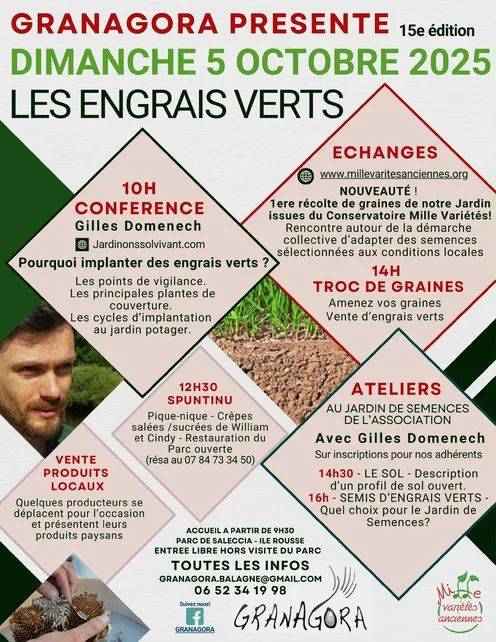 10h : Conférence ”Pourquoi implanter des engrais verts?”, animée par Gilles DOMENECH (Spécialiste des sols et créateur du blog ”jardinons sol vivant”) interviendra autour de la question cruciale des engrais verts . Les points de vigilance, les principales plantes de couverture et les cycles d'implantation au jardin potager. L'intervenant fera un tour d'horizon de la question et s'efforcera de répondre à nos interrogations.