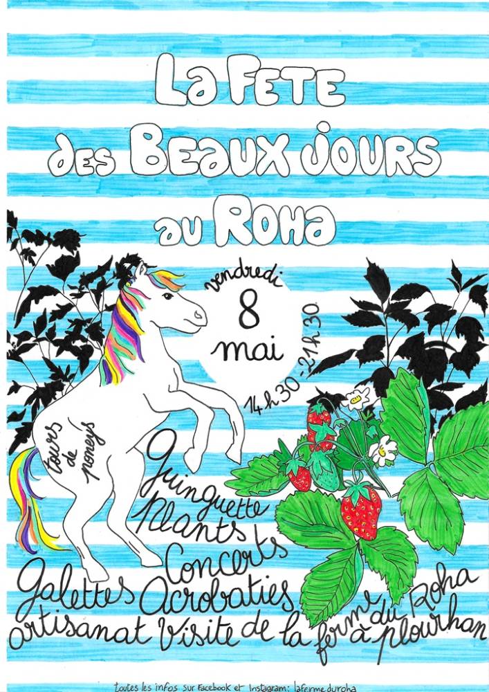 Retrouvez-nous à la Ferme du Roha le 8 mai pour une vente de plants bio et locaux et d'artisanat. Vous pourrez visiter la ferme, faire des tours de poneys, voir des acrobaties, profiter de la guinguette dans une atmosphère printanière et musicale. Petite restauration sur place. Retrouvez le programme détaillé de la fête sur le Facebook ainsi que sur l'Instagram de la Ferme du Roha.