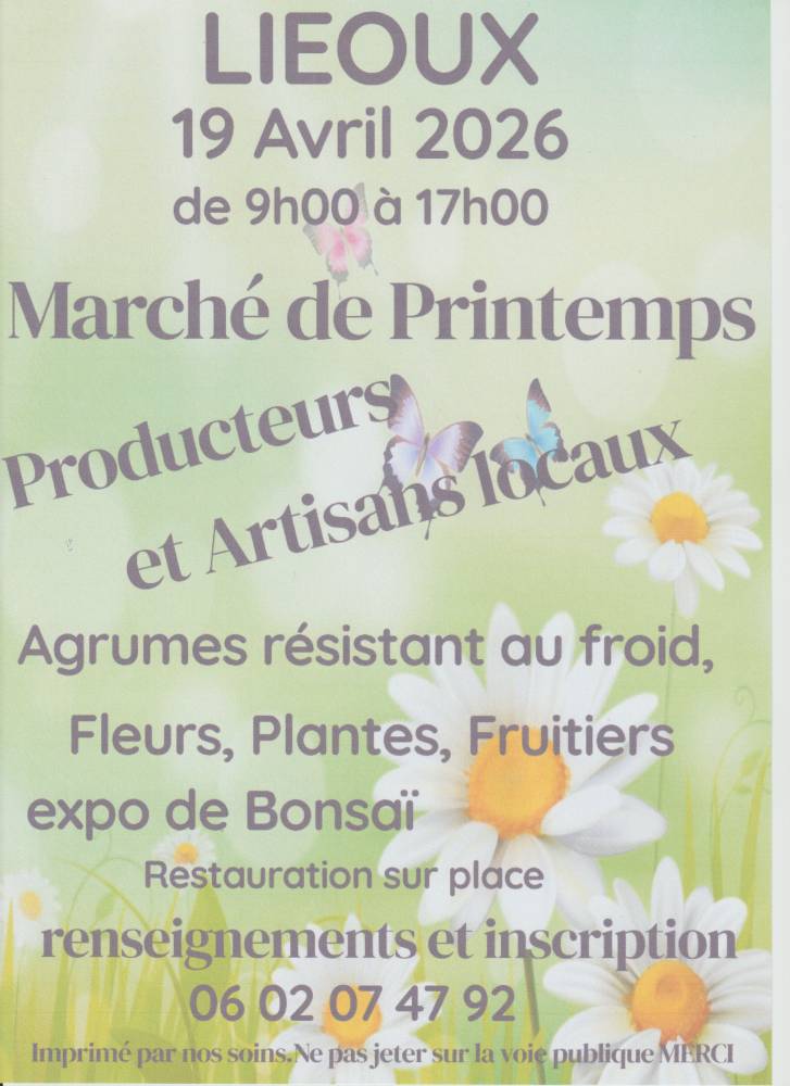 L’association les 4 Saisons organise son Marché de Printemps le 19 Avril 2026 de 9h00 à 17h00 à l’espace salle des fêtes de LIEOUX. Vous y trouverez des agrumes résistant au froid, une belle expo de Bonzaï. Des producteurs et artisans locaux, fleurs, plantes et fruitiers. Restauration grillades et vente de gâteaux maison.