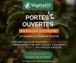 Le week-end du 18 et 19 octobre 2025 nous serons en portes ouvertes avec 10 % de remise sur tous vos achats emportés, une tombola avec des bons d'achats de 500€, 250€, et 50€ à gagner, 2 ateliers de taille des fruitiers, la possibilité d'apporter ses outils à aiguiser, ... Journée continue de 9h à 18h. La Fuinière 85310 LA CHAIZE LE VICOMTE.