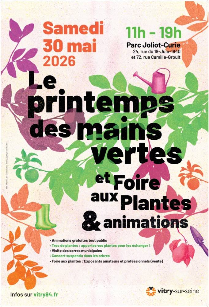 Le Printemps des mains vertes, c’est le rendez-vous printanier de la nature en ville à Vitry ! Cette année, cet événement festif aura lieu le 30 mai de 11h à 19h dans le parc Joliot-Curie.