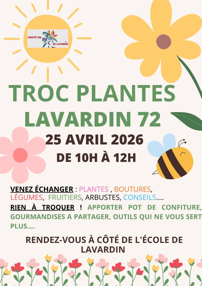 Seconde édition du troc plantes de Lavardin organisé par le comité des fêtes. Le samedi 25 avril de 10h à 12H. Echanges de plantes,boutures et autres. Gratuit