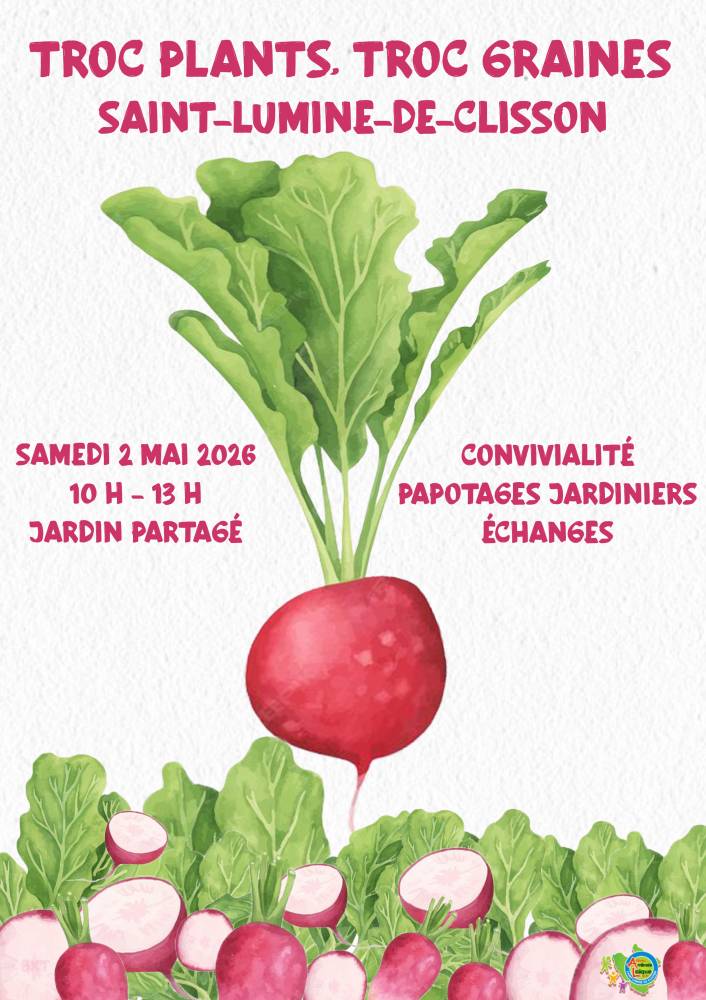 La section Jardin Partagé de l'Amicale Laïque de Saint-Lumine de Clisson a le plaisir d'organiser la 11ème édition de son Troc Plants & Graines le samedi 2 mai 2026 de 10h à 13h. Nous invitons les troqueurs/visiteurs à se stationner au parking de l'église ou au parking de la bibliothèque municipale (fléchage depuis le centre du bourg pour se rendre au jardin à 150m). Convivialité, échanges libres de plants-plantes-boutures-graines, papotages jardiniers avec conseils et astuces seront au programme de cet évènement gratuit.