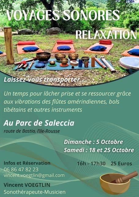 Vincent Voegtlin est sonothérapeute et musicien, curieux et passionné de musique depuis l’enfance. J'aime faire voyager à travers mon univers musical riche et varié, inspiré des différentes cultures du monde. Les voyages sonores que je propose sont une invitation à se laisser porter par les sons des instruments, tels que les flûtes amérindiennes, les bols tibétains, carillons, sansula… Leurs sons et vibrations vous guident vers des espaces de calme, d’évasion, d’exploration… et vous offrent une vraie pause dépaysante pour vous ressourcer. Infos et résa : 06.86.47.82.23/ vincent.voegtlin@gmail.com Sur inscription auprès de l'intervenant. Tarif : 25€ la séance Tarif : 25€ Dimanche 5 octobre; samedis 18 et 25 octobre. 16h-17h30).